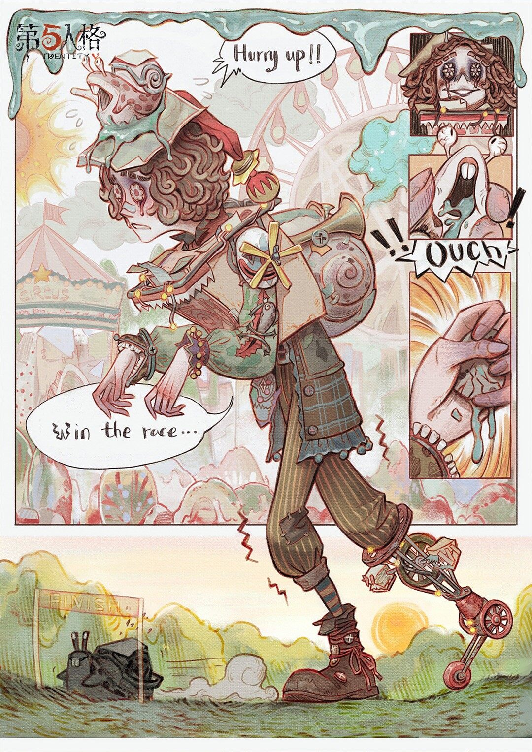 【稀世时装】哭泣小丑-逐风蜗缀着星星的小丑帽被盖在了传单下,厚实的纸箱是带给他安全感的外壳,好胜的伙伴们栖居在头顶与衣袖,不停催促着他的脚步。身后的蜗壳喷出绿色的云雾,为他带来追逐风的动力。袖口与义肢的轮轴上都生长出了小小的牙齿,悄悄啃食着他心中疯狂的念头。被改装的蜗牛缠绕着闪闪发光的灯带,再也不是慢吞吞的角色,它目光炯炯,飞驰如风,抛去了沉重的外壳,但也变成了一具空壳。
