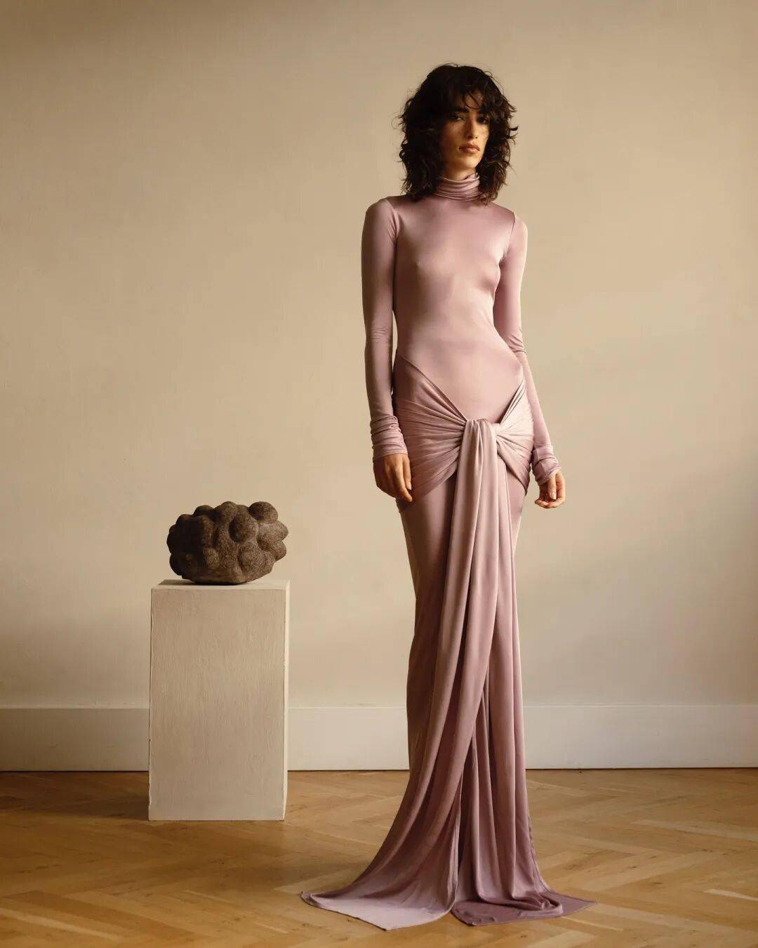 其形象也与盛行的大女主风形成对照,更为柔韧、舒展而富有内在力量。衣物上自由延伸的弧线、建筑般的雕塑廓形,皆隐喻着女性刚柔并济的美。
