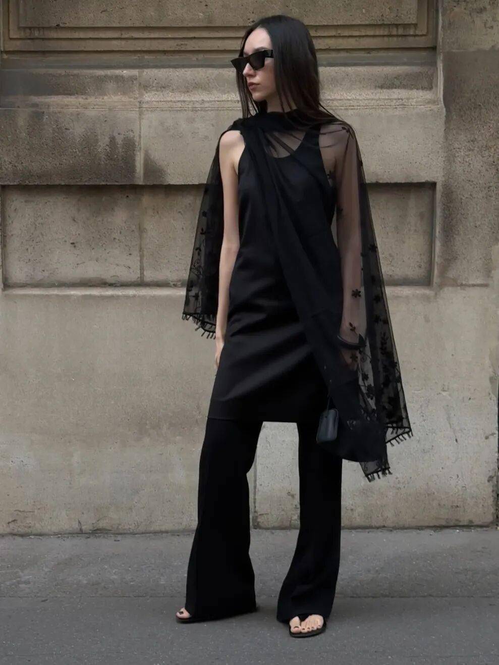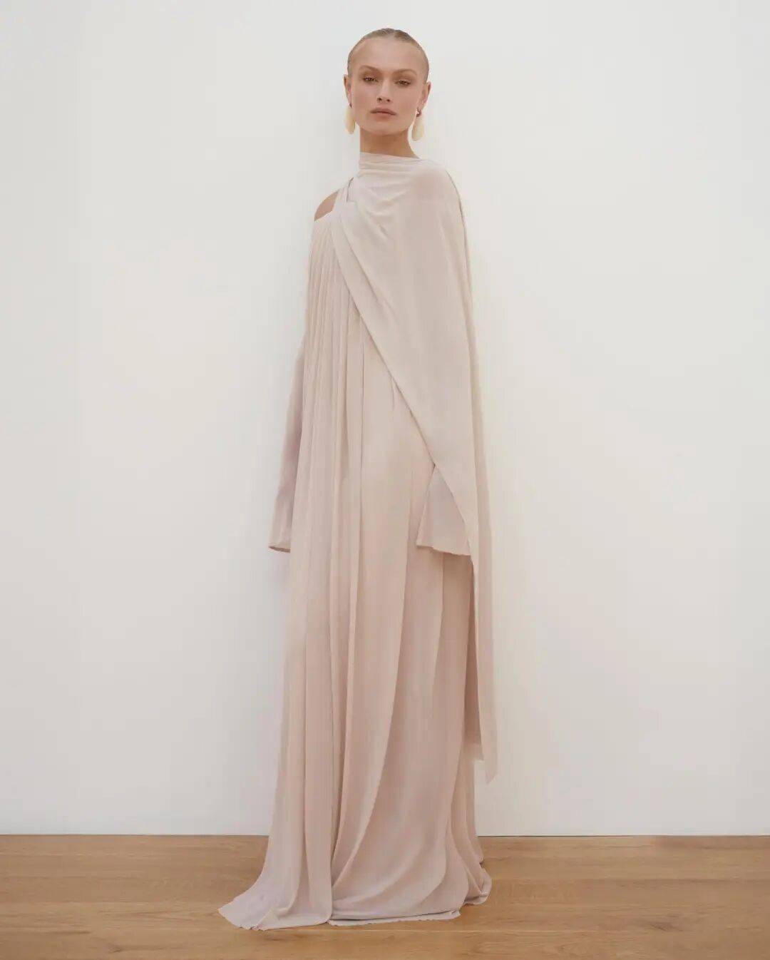 立体皱褶如古希腊雕塑般经典,轻盈薄纱披风带来飘逸仙气,配合流畅剪裁与优质面料,即便是中性色调也能摇曳生姿。这种轻松而高级的优雅,正是当下 Clean Fit、知识分子风、老钱风竭力诠释的核心,而艺术系贵妇们却举重若轻,将其穿得自然天成。