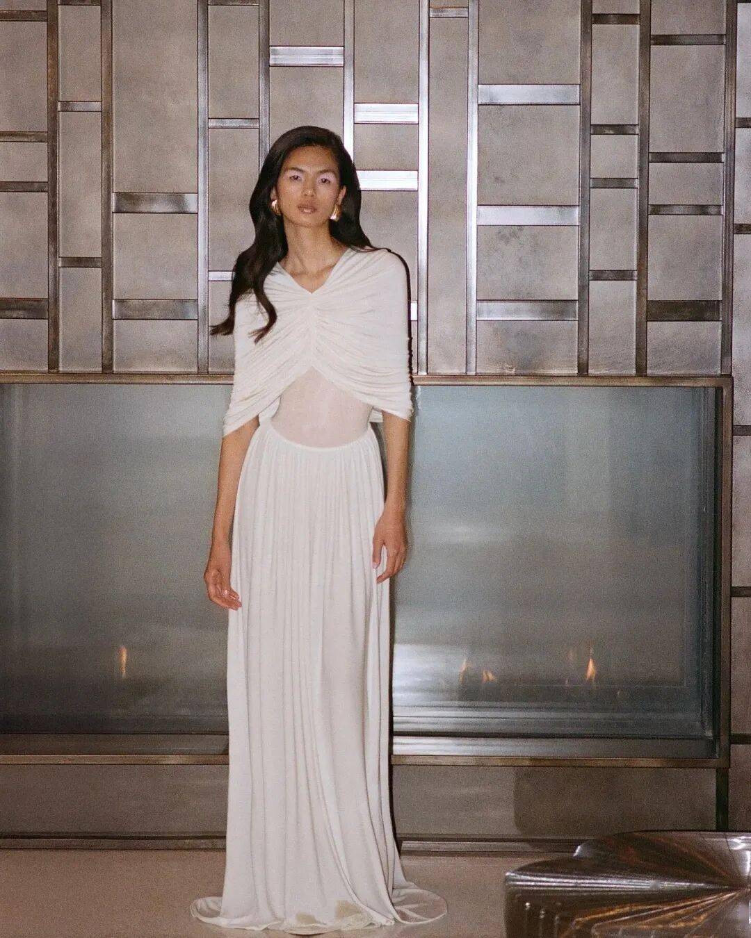 另一代表单品雕塑皱褶连衣裙,则以结构重塑身形线条,令布料随着身体流泻出优美弧度,上身即如美神降临,无怪成为风格标志。从肩线至裙摆的流动曲线,搭配金属手镯作为“休止符”,轻重对比间,亦透出几分 Saint Laurent 女郎的洒脱与强势。