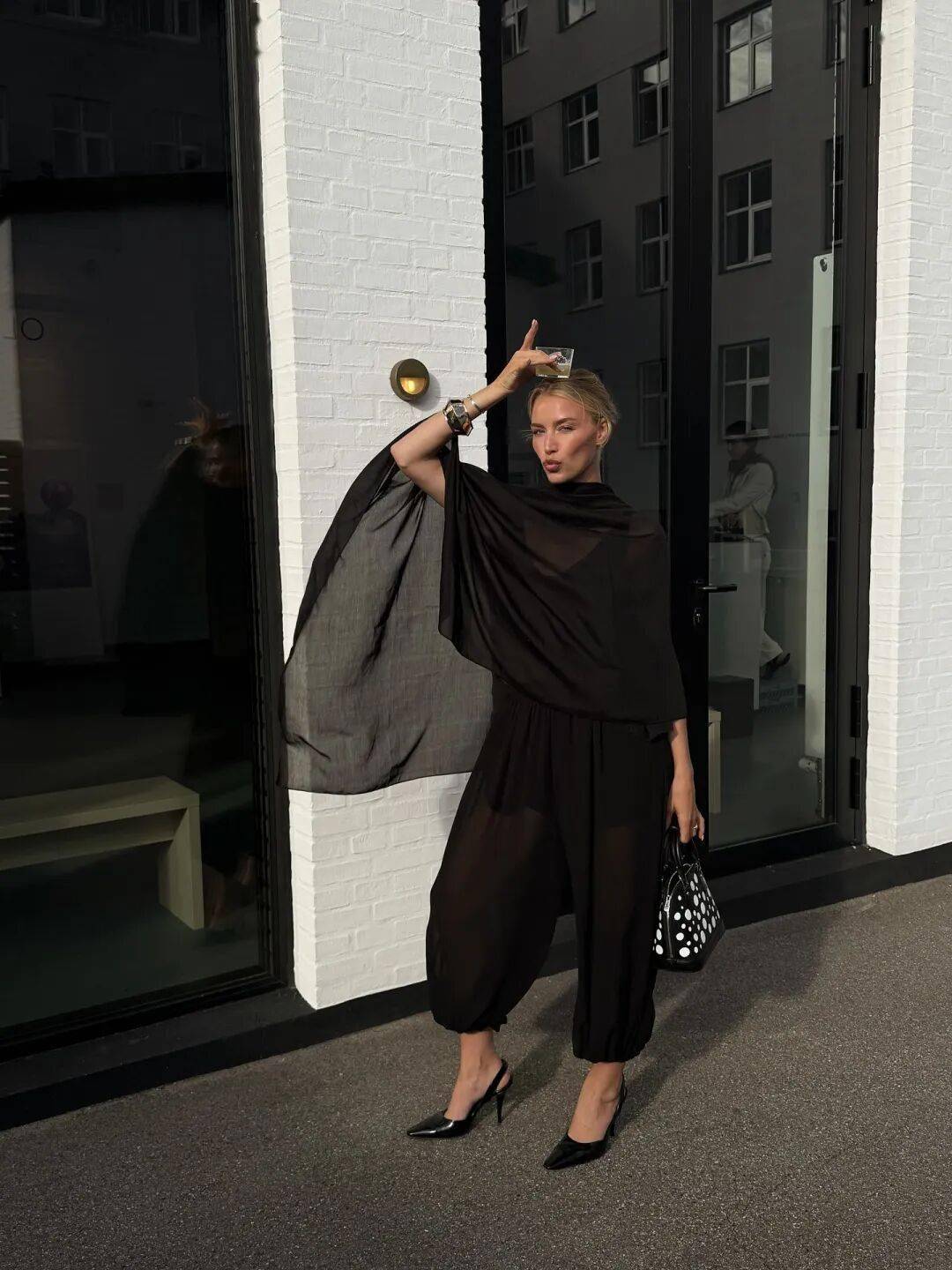 披风类单品堪称该风格标志,在 Ins 上出镜率极高。Beatrice Gutu 可谓“万物皆可披风”,而 Annemiek Kessels 则偏好将其与西装裤或直筒裙搭配,保持利落之余更添柔和。她对飘逸披风与飘带单品尤为青睐,收集众多心仪款式,每一件皆易搭配,比基础款独特,较设计款实穿。